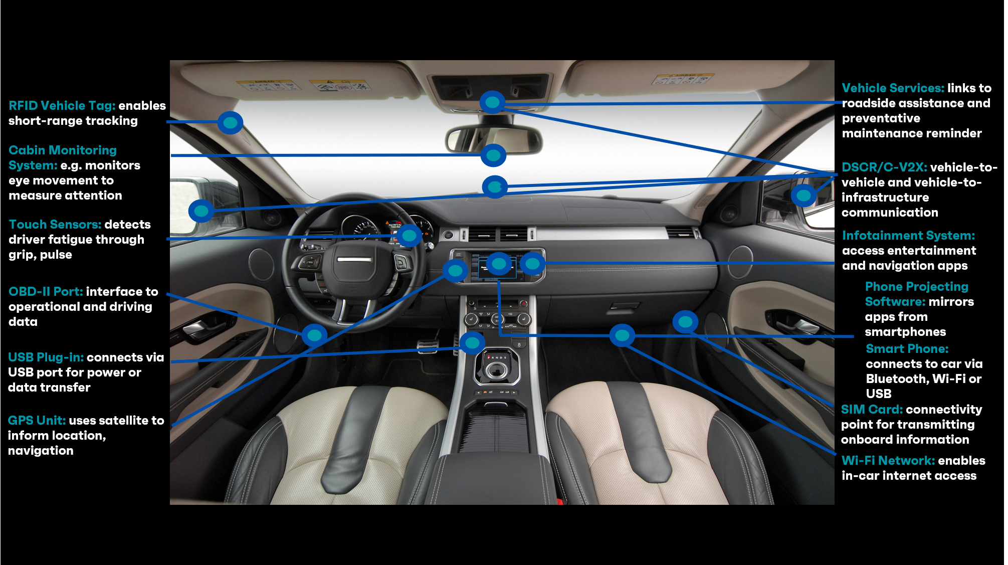 (1) in-vehicle connected services, including safety services, for drivers and passengers; (2) the ability for owners to interact with their vehicles from their smartphones; and (3) V2V and V2I communication that helps vehicles detect and respond to the surrounding environment, etc.